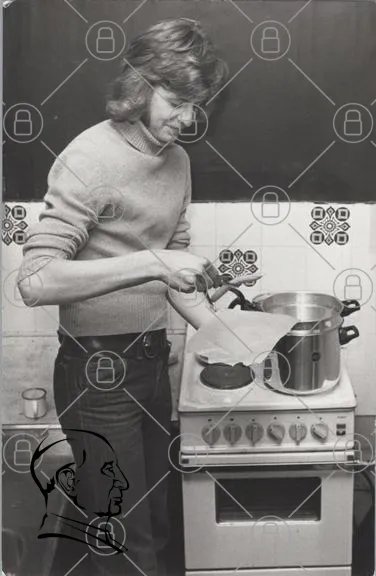 kvinna, kök, matlagning, kastrull, skärbräda, kniv, svartvitt, retro, 1970-tal, hushåll, recept, ingredienser, köksutrustning, förbereda, måltid, inredning, kläder, hår, hand, ångkokare, platta, vägg, kakel, fokus, aktivitet, hemlagat, traditionell, stil, hemma, vardag, livsstil