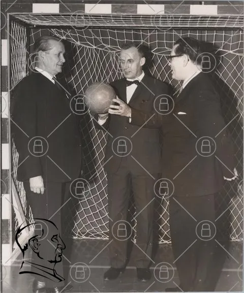 handboll, män, kostymer, boll, nät, sport, 1960-tal, svartvitt, fotografering, evenemang, leende, tradition, samarbete, presentation, stil, retro, idrott, mänsklig interaktion, festlig, aktivitet