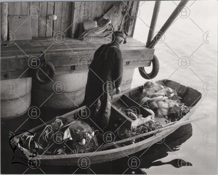 fiskare, båt, fiskeutrustning, nät, hav, trä, brygga, svartvit, vatten, fiske, man, fiskeplats, redskap, fiskeindustri, traditionellt, maritimt, fiskehistorik, skaldjur, fångst, arbetskläder, lugn, natur, hantverk, yrke, sjö, fiskehamn, fiskeområde, fiskeverksamhet, båttransport