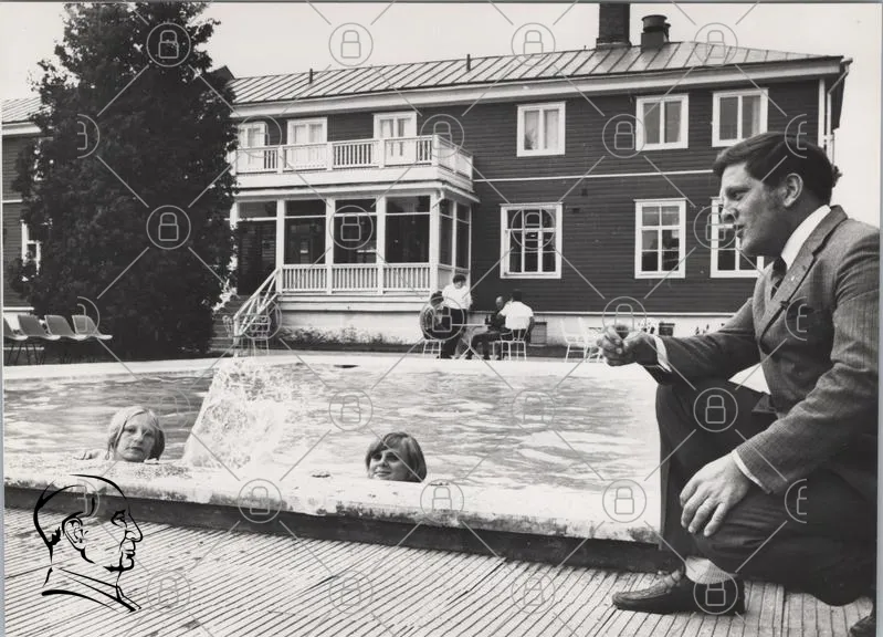 pool, människor, hus, trädgård, vatten, svartvitt, ansikten, utomhus, möbler, stolar, 1960-tal, retro, arkitektur, sommar, avslappning, socialt, fritid, spegelbild, fototillfälle, familj, vänner, leenden, natur, landskap, stil, tradition, kultur, nostalgi, gemenskap