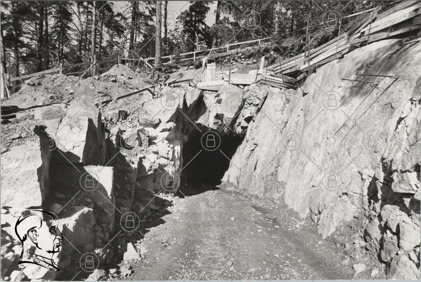 tunnel, berg, grusväg, träd, sten, byggarbetsplats, natur, landskap, svartvitt, väg, ingång, konstruktion, avverkning, skog, klippblock, gruvdrift, vägbygge, staket, markarbete, fotot, gammal, historisk, utgrävning, geologi, miljö, landskapsfotografi, vägkant, skogsområde, stenblock, gruvtunnel