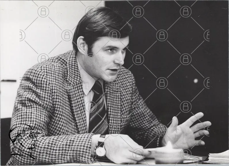 man, kostym, skjorta, slips, skrivbord, svartvitt, 1970-tal, diskussion, allvarlig, kontor, ljus, gest, ansiktsuttryck, professionell, interaktion, presentation, stil, kläder, hår, bakgrund, fokus, uttryck, kroppsspråk, kommunikation, miljö, detaljer, belysning, atmosfär, vintage, porträtt