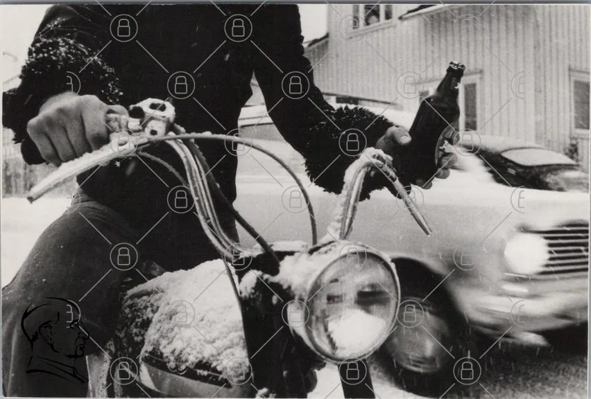 motorcykel, snö, vinter, öl, svartvitt, man, hand, cykelstyre, kläder, kallt, landskap, byggnader, retro, stil, fotografering, utomhus, nöje, transport, tradition, kultur, 1900-tal, vinterkläder, fest, fritid, hobby, motorcykelåkning, snöfall, vinterlandskap, vintage