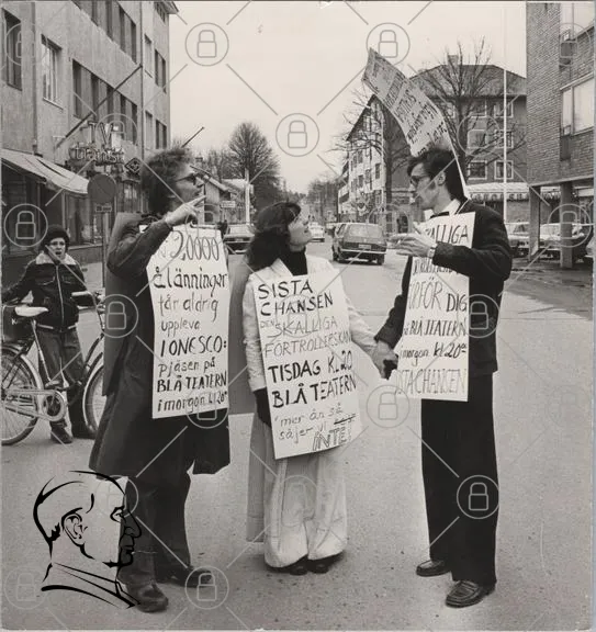 demonstration, protest, affischer, människor, gator, 1970-tal, teater, blå teatern, skyltar, samhälle, aktivism, cykel, kläder, svartvitt, stadsbild, medborgarrätt, kultur, engagemang, social rättvisa, offentligt rum