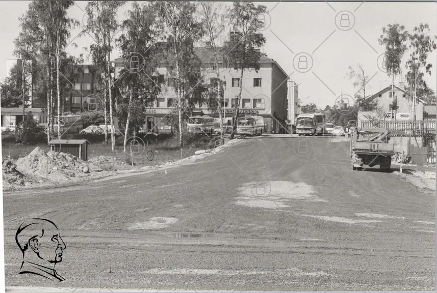 gata, byggnader, träd, bussar, asfalt, svartvitt, väg, cykel, parkering, stadsbild, 1960-tal, trafik, bostäder, skyltar, grus, landskap, fotgängare, fordon, urban, miljö