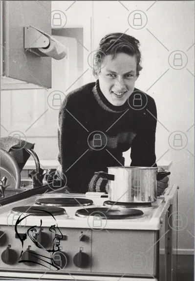 kök, man, matlagning, kastrull, svartvitt, leende, tröja, spis, köksutrustning, retro, inomhus, 1970-tal, hushåll, recept, vardag, ungdom, kock, hemlagat, köksmiljö, kreativitet