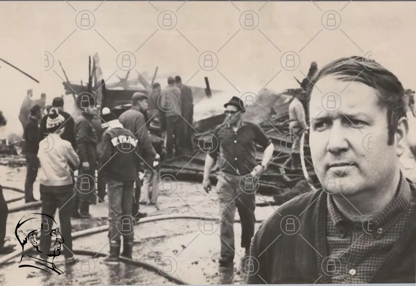 brand, rök, människor, ruiner, brandmän, katastrof, svartvitt, räddning, olycka, byggnad, skador, insats, historia, 1970-tal, samhälle, sorg, arbete, brandstation, säkerhet, överlevnad