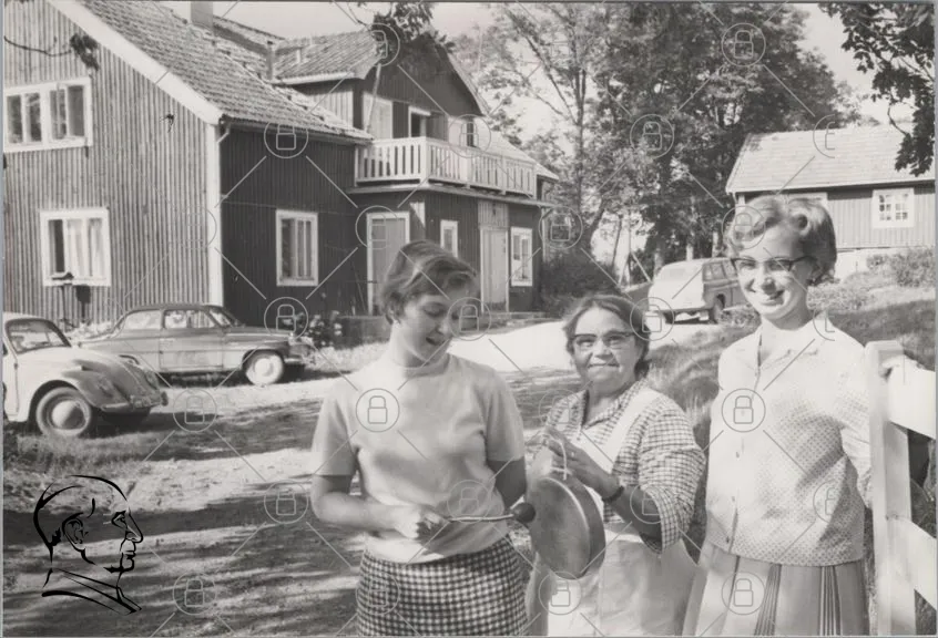 kvinnor, 1950-tal, sommar, hus, trädgård, bilar, kläder, leende, kök, tallrikar, svartvitt, vänskap, utomhus, familj, tradition, nostalgisk, landsbygd, fritid, gemenskap, aktiviteter, ungdomar, skandinavisk, kultur, minnen, fotografering, avslappnad, glädje, samvaro, natur
