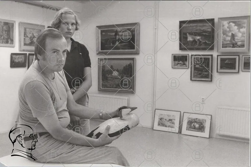 konst, galleriet, målningar, svartvitt, man, kvinna, skulptur, inomhus, 1970-tal, porträtt, kultur, fotografi, utställning, konstverk, traditionell, stil, konstnär, besökare, konsthall, retro