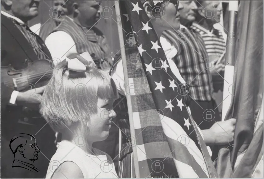 barn, flagga, USA, svartvitt, parader, tradition, kläder, folkmassa, leende, hårband, 1960-tal, fest, patriotism, kultur, samling, ansikten, glädje, gemenskap, historia, evenemang