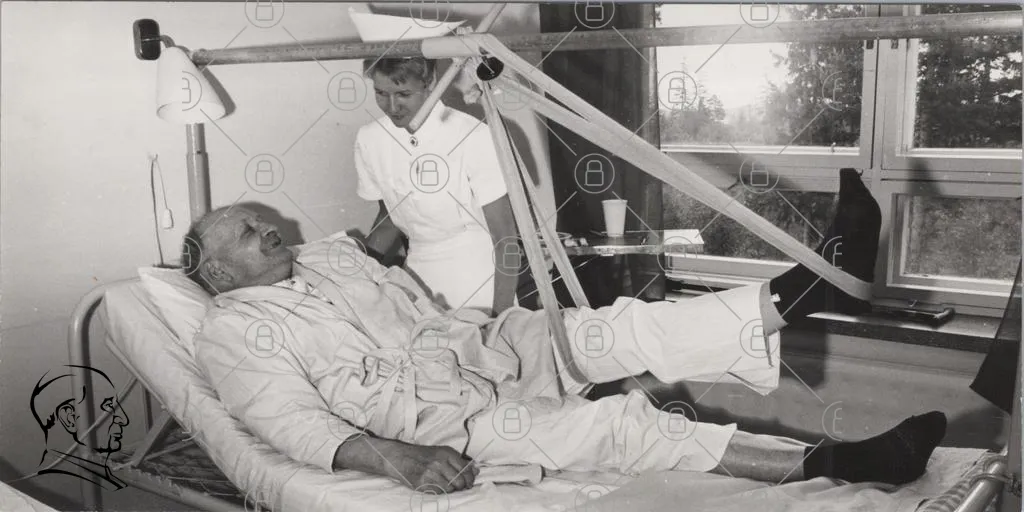 sjukhus, patient, sjuksköterska, behandling, medicinsk, vård, rehabilitering, säng, medicinsk utrustning, 1950-tal, man, kvinna, vit, kläder, leende, hjälp, fysioterapi, röntgen, sjukhusmiljö, medicinsk personal, vårdmiljö