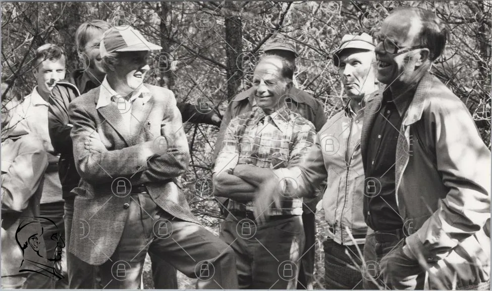 skog, män, skratt, samtal, hattar, kläder, svartvitt, natur, vänskap, samvaro, trä, leende, 1900-tal, utomhus, grupp, tradition, avslappnad, ansikten, gemenskap, minnen