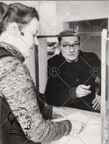 man, kvinna, kontor, disk, samtal, svartvitt, 1960-tal, glas, papper, kläder, ansiktsuttryck, dokument, interaktion, äldre, yngre, skrivbord, kontorsmiljö, retro, traditionell, kommunikation, arbete, administration, service, människa, professionell, social, situation, vardag, historia, kultur