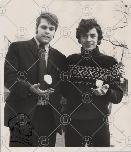 snö, snöboll, vinter, män, svartvitt, kläder, tröja, kostym, leende, utomhus, träd, ungdomar, 1960-tal, fotografi, vänskap, humor, sport, aktivitet, snöfall, tradition