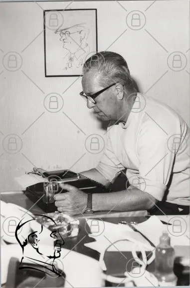 man, skrivmaskin, bord, glas, klocka, svartvitt, inomhus, fokus, arbete, kreativitet, 1900-tal, kontor, skrivande, dokument, papper, kläder, glasögon, koncentration, stillhet, retro, vintage, teknik, hantverk, skrivande process, arbetsmiljö, hand, ansikte, uttryck, detaljer, miljö