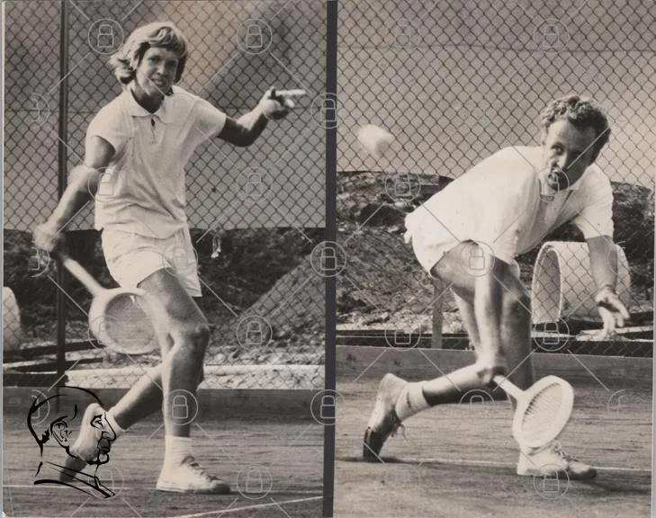 tennis, spelare, racket, boll, grus, match, sport, träning, 1970-tal, svartvit, utomhus, nät, kläder, motion, tävling, teknik, fotarbete, koncentration, idrott, ungdomar, aktivitet, bana, stil, rörelse, svett, prestation, samarbete, vänskap, passion, energi, fokus