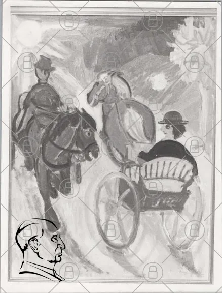 hästar, ritt, vagn, man, kvinna, hattar, landskap, svartvitt, konst, ridning, körning, träd, sol, väg, stiliserat, figurativt, rörelse, landsbygdsidyll, traditionellt, kultur, 1800-tal, häst och vagn, porträtt, natur, skugga, ljus, komposition, konstverk