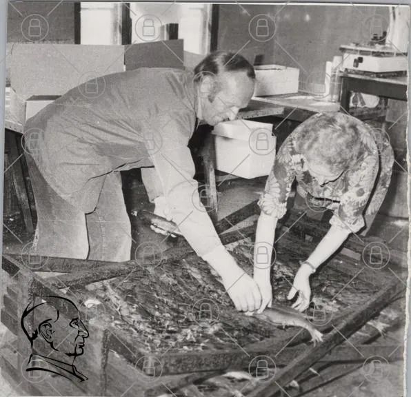 fisk, arbete, man, kvinna, laboratoriemiljö, forskning, experiment, handarbete, skala, mat, djur, natur, vetenskap, svartvitt, historisk, samarbete, verktyg, inspektion, utbildning, tradition, process, livsmedel, hav, sällsynta, arter, biologi, ekologi, marin, hållbarhet, provtagning
