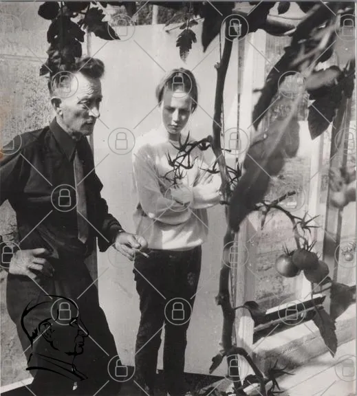 svartvitt, foto, man, kvinna, växter, tomater, trädgård, 1940-tal, kläder, rökning, eftertänksam, växthus, ansiktsuttryck, interaktion, natur, odling, traditionell, miljö, vintage, historia
