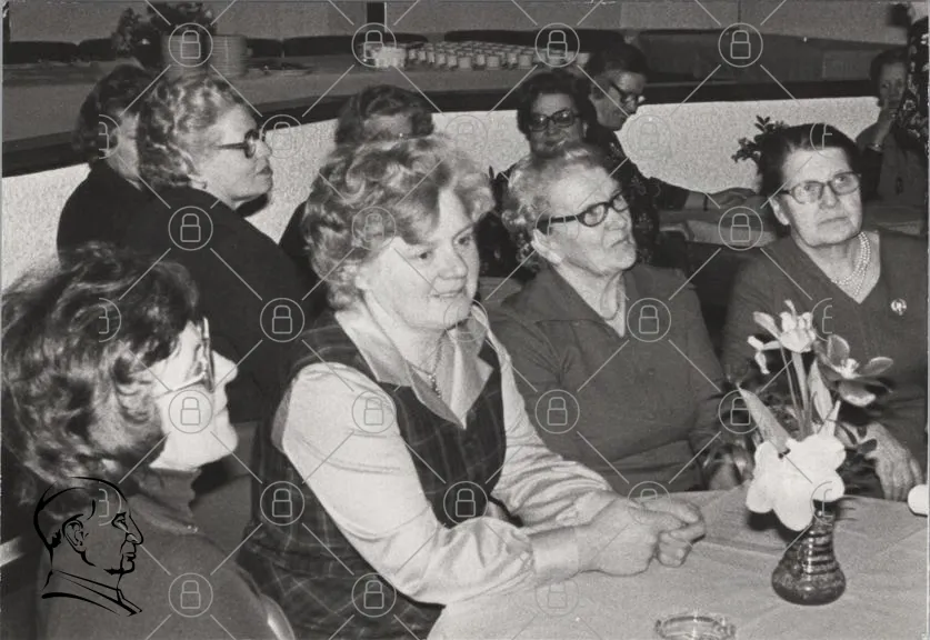 kvinnor, möte, 1960-tal, svartvitt, bord, samtal, glasögon, leende, kläder, frisyrer, socialt, gemenskap, fest, äldre, tradition, kultur, bakgrund, dekoration, blommor, samling, minnen