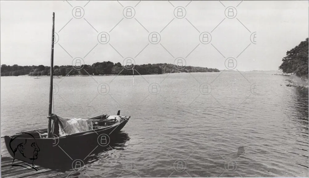båt, vatten, sjö, ö, träd, landskap, svartvitt, reflektion, himmel, natur, stillhet, fiske, transport, sommar, lugn, panorama, horisont, skärgård, båtliv, avkoppling