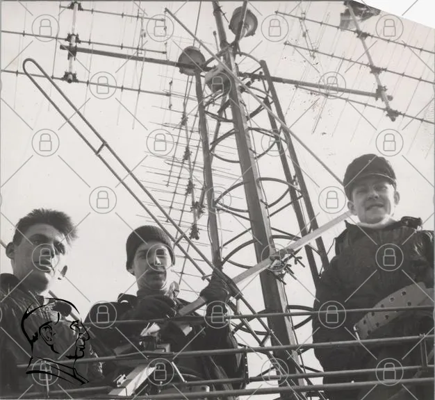 pojkar, antenn, teknik, svartvitt, ungdomar, 1960-tal, utomhus, metall, utrustning, leende, vintage, radio, kommunikation, stående, kläder, ungdomskultur, fotografering, grupp, hobby, experimentera