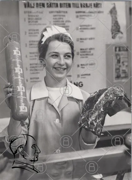 kvinna, leende, korv, kött, butik, svartvitt, 1960-tal, kläder, förkläde, frisyr, mat, livsmedel, försäljning, handla, tradition, retro, historisk, produkt, konsumtion, service, livsstil, glädje, varor, marknad, hand, presentation, reklam, lokal, samhälle, kultur