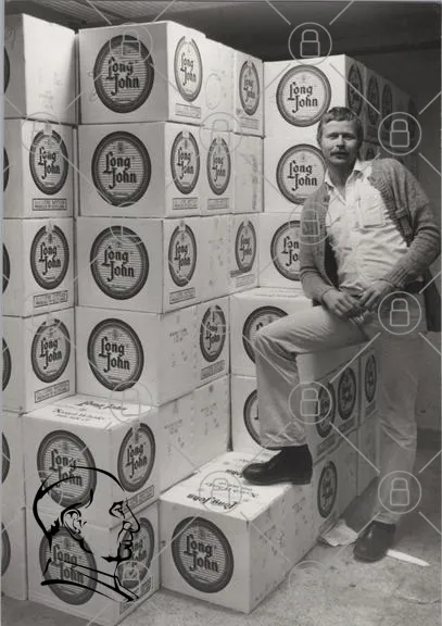 Long John, lådor, man, svartvitt, kläder, sittande, förpackningar, reklam, vintage, 1980-tal, stil, lager, produkt, pose, inomhus, distribution, varumärke, logotyp, boxar, fotografi, retro, affär, industri, människa, stilren, casual, mode, samling, bakgrund, förråd