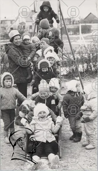 barn, lekplats, vinter, snö, mössor, jackor, leende, grupp, vuxen, glädje, utomhus, lek, barnomsorg, svartvitt, kläder, kamrat, skratt, barnlek, gemenskap, trygghet, minnen, barndom, natur, aktivitet, fotografering, tradition, familj, samvaro, roligt, vänskap