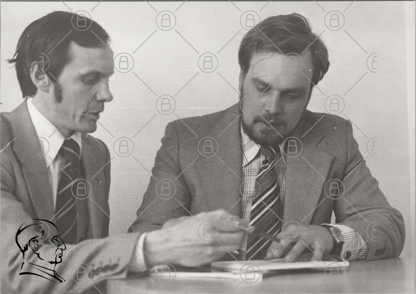 två män, kostymer, 1970-tal, diskussion, skrivbord, anteckningar, glasögon, papper, affärsmöte, svartvitt, professionell, kontor, kläder, stil, ansiktsuttryck, samarbete, kommunikation, noteringar, detaljer, interaktion