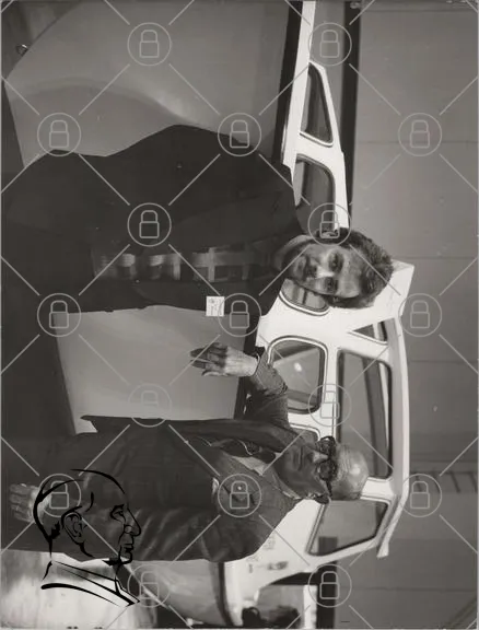 svartvitt, män, bil, kläder, kostymer, mässa, 1970-tal, teknik, presentation, stående, interiör, ansikten, stil, retro, fordon, utställning, affärsmöte, historia, vintage, design