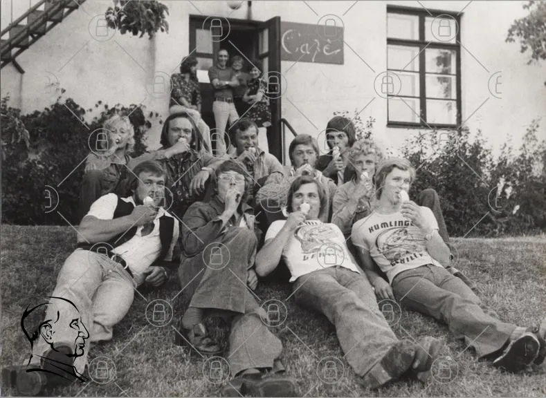 grupp, människor, café, utomhus, 1970-tal, retro, kläder, skratt, glass, trappa, gräs, svartvitt, socialt, vänner, ungdomar, avslappnat, samling, fotografi, nostalgi, gemenskap