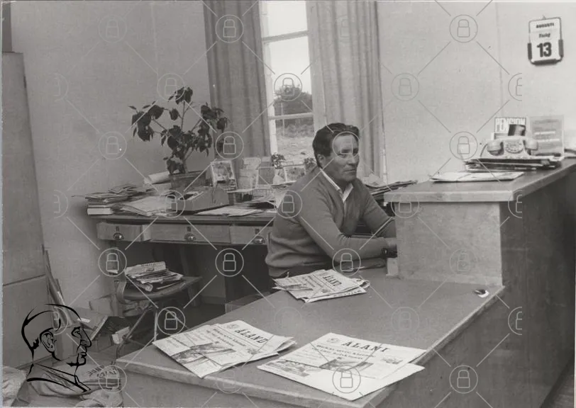 man, skrivbord, tidningar, kontor, fönster, växt, papper, svartvit, kläder, inredning, 1970-tal, arbetsplats, böcker, tidningsartiklar, fotografi, dokument, stolar, skrivmaskin, kontorsmaterial, tidningsstapel