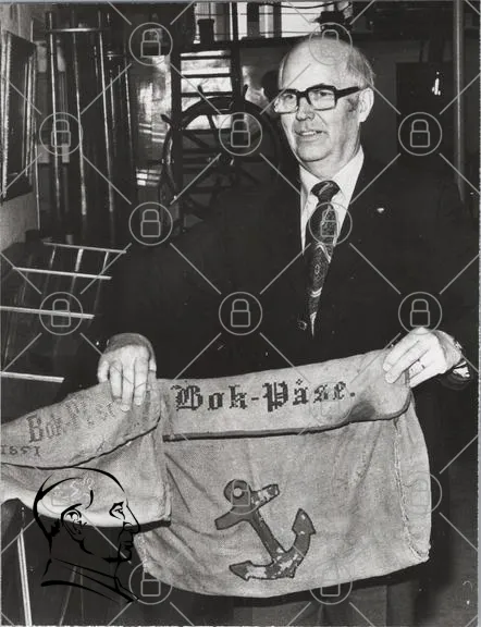 man, svartvitt, kläder, bokpåse, ankar, 1957, museum, historia, text, vintage, accessoarer, segling, maritim, tradition, kultur, föremål, utställning, hand, kostym, slips, glasögon