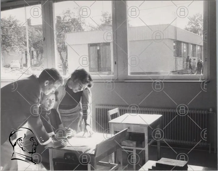 klassrum, elever, lärare, skrivbord, fönster, svartvitt, utbildning, samarbete, 1960-tal, skola, böcker, anteckningar, diskussion, lärande, interaktion, studier, pedagogik, kontor, möte, ungdomar