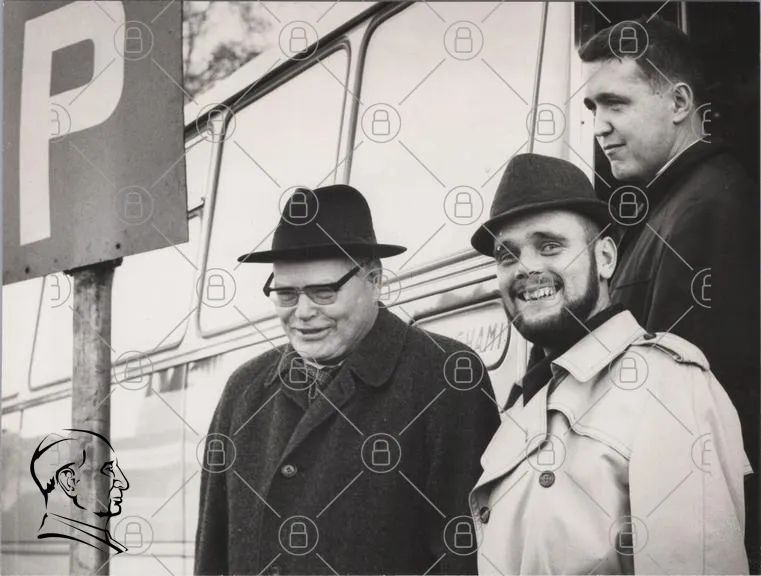 historisk, svartvit, män, hattar, glasögon, leende, kläder, 1900-tal, grupp, utomhus, busshållplats, fotografi, ansikten, stil, nostalgi, samhälle, kultur, tidsepok, porträtt, interaktion, vänskap, minnen, resor, transport, busstrafik, miljö, människor, samling, tradition