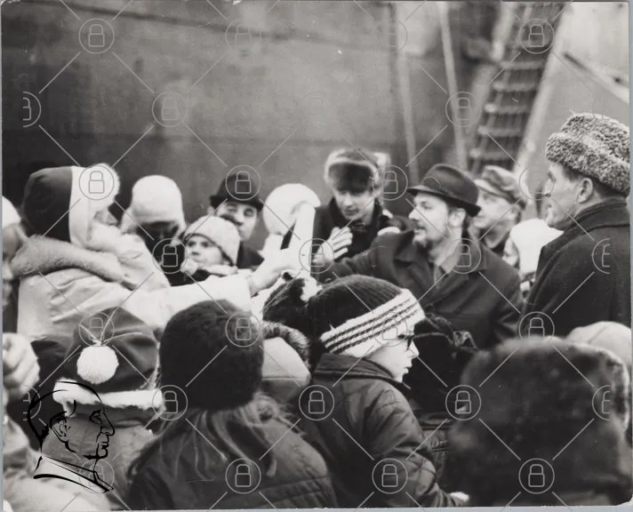 svartvit, människor, samling, vinterkläder, hattar, mössor, båt, hamn, interaktion, ansikten, känslor, tradition, fest, gemenskap, fotografering, historisk, 1900-tal, barn, vuxna, utomhus, socialt