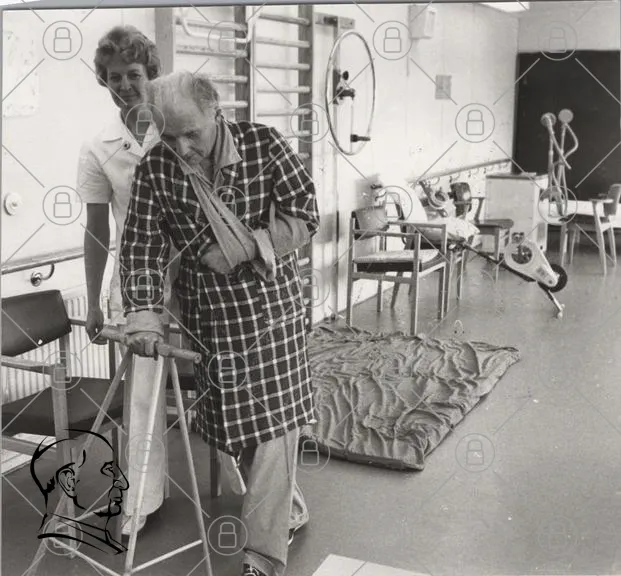sjukhus, vårdpersonal, gammal man, rullator, rehabilitering, sjuksköterska, inomhus, hjälpmedel, patient, vårdmiljö, 1980-tal, kläder, stöd, träning, hälsa, äldre, vård, terapi, rum, möbler, golv, aktivitet, stödja, leende, omsorg, rehabiliteringsutrustning, sjukhusmiljö, vårdtagare, medicinsk, stödjande, interaktion