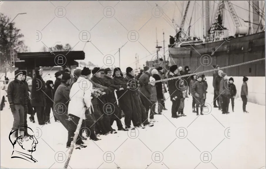 snö, människor, rep, dragkamp, vinter, barn, vuxna, hamn, båtar, svartvitt, gemenskap, aktivitet, tradition, kläder, friluftsliv, samarbete, historisk, kultur, fest, rolig, is, landskap, fotografering, 1900-tal, socialt, evenemang, teamwork, styrka, glädje