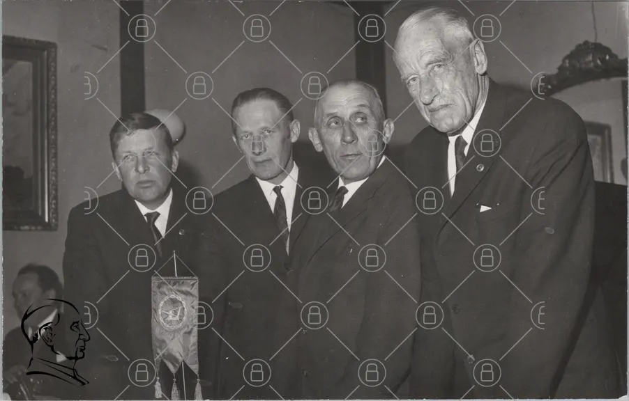 historisk, svartvit, gruppfoto, män, kostymer, medaljer, ceremoni, 1900-talet, tradition, samling, utmärkelse, flagga, organisation, ansikten, uttryck, kläder, bakgrund, dokumentation, minne, evenemang