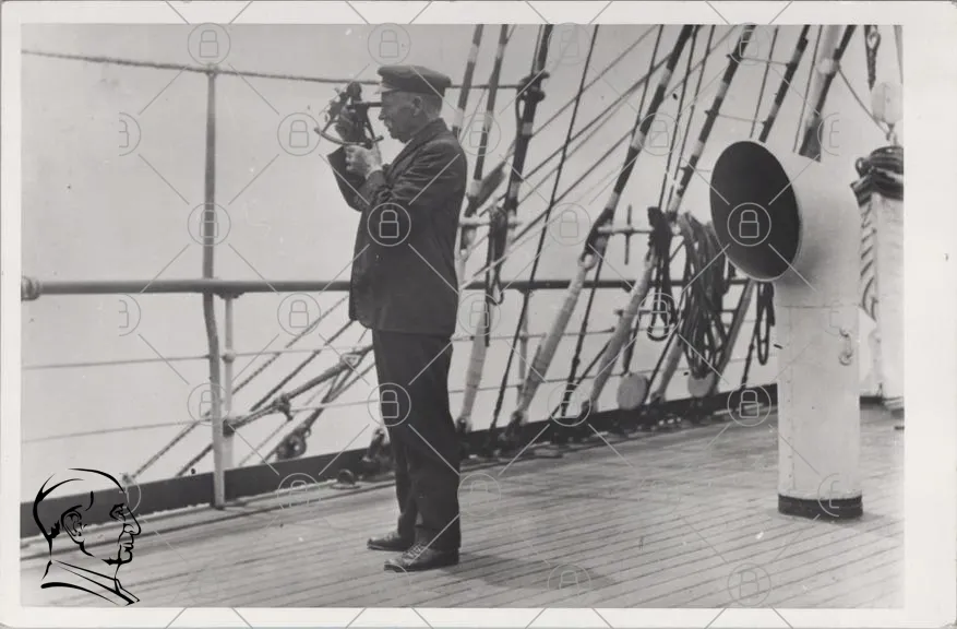 man, båt, segelbåt, navigering, sextant, hav, sjö, kläder, hatt, trä, rigg, rep, vintage, svartvitt, fotografi, maritim, historia, segling, kapten, fartyg, däck, instrument, observation, sjöman, traditionell, teknik, 1900-tal, nautisk, expedition, resande