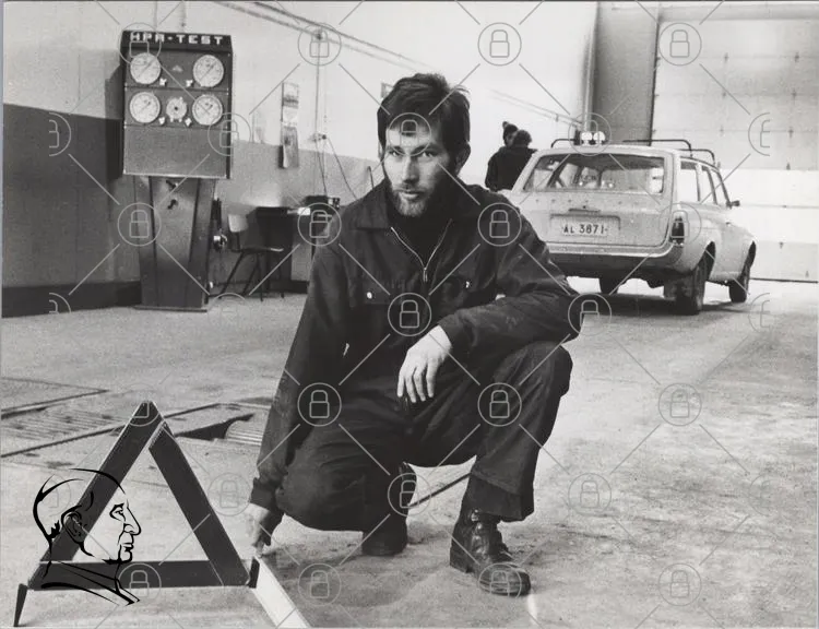 man, verkstad, mätning, teknik, 1970-tal, svartvitt, bil, utrustning, arbetskläder, verktyg, experiment, mekanik, industri, precision, laboratorium, tester, fordon, hantverk, professionell, arbete
