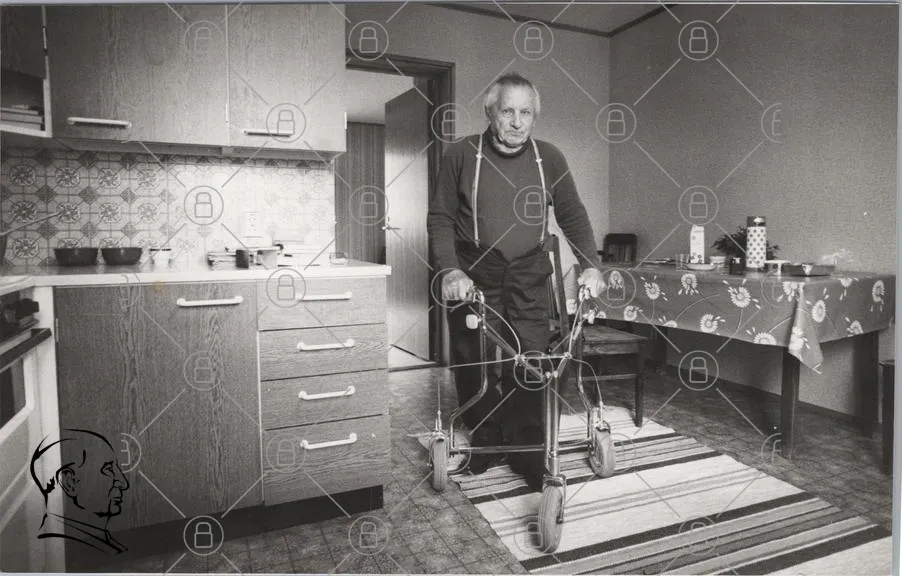 gammal man, rullator, kök, inomhus, möbler, bord, stol, matta, väggar, belysning, svartvitt, hem, äldre, stöd, livsstil, vardag, rum, retro, heminredning, person, aktivitet, ensamhet, interiör, fotografi, nostalgi, tradition, hälsa, rörelse, ålder, trygghet