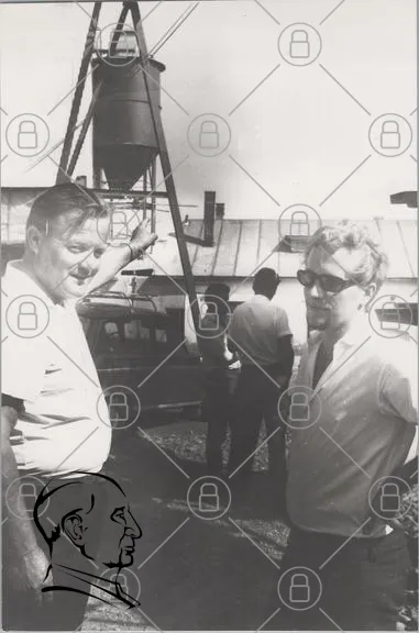 historisk, svartvit, män, diskussion, byggnad, utomhus, 1960-tal, kläder, solglasögon, fordon, industri, arbete, teknik, grupp, miljö, verktyg, maskiner, fabrik, landskap, mänsklig interaktion