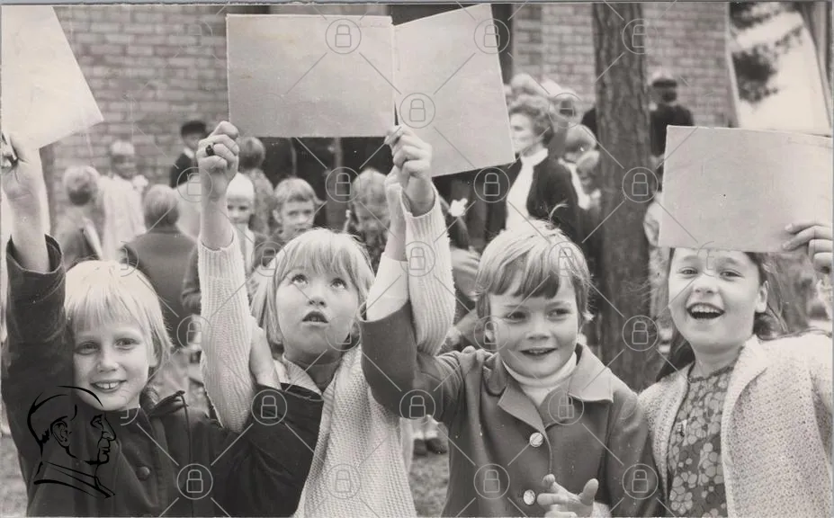barn, skola, svartvitt, 1960-tal, lek, glädje, uppvisning, papper, händer, kläder, pojke, flicka, grupp, utomhus, fotografering, tradition, ungdomar, ansikten, samling, aktivitet, minnen, nostalgi, barnlek, skratta, gemenskap, skolfoto, vintage, retro, barnprogram, presentation, tecken