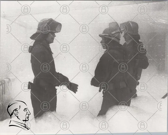 brandmän, brand, räddning, brandstation, säkerhet, teamwork, uniform, hjälmar, rök, snö, vinter, kommunikation, insats, nödsituation, professionell, samarbete, utomhus, historisk, svartvit, bild