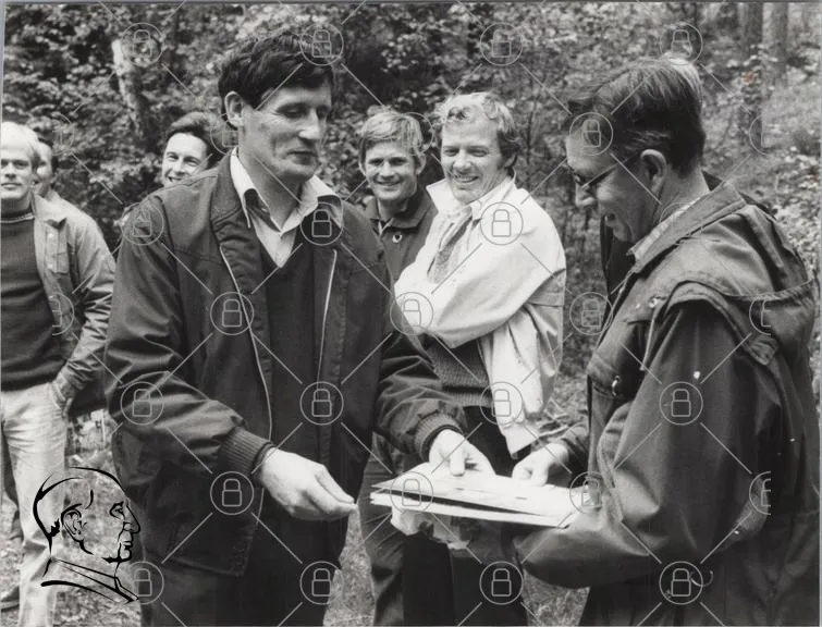 svartvitt, grupp, män, utomhus, skog, samtal, dokument, kläder, 1970-tal, fotografi, leende, interaktion, natur, tradition, historia, möte, vänskap, gest, ansiktsuttryck, samarbete, minnen, nostalgi, socialt, gemenskap, aktivitet, presentation, handskakning, uppvaktning, informell