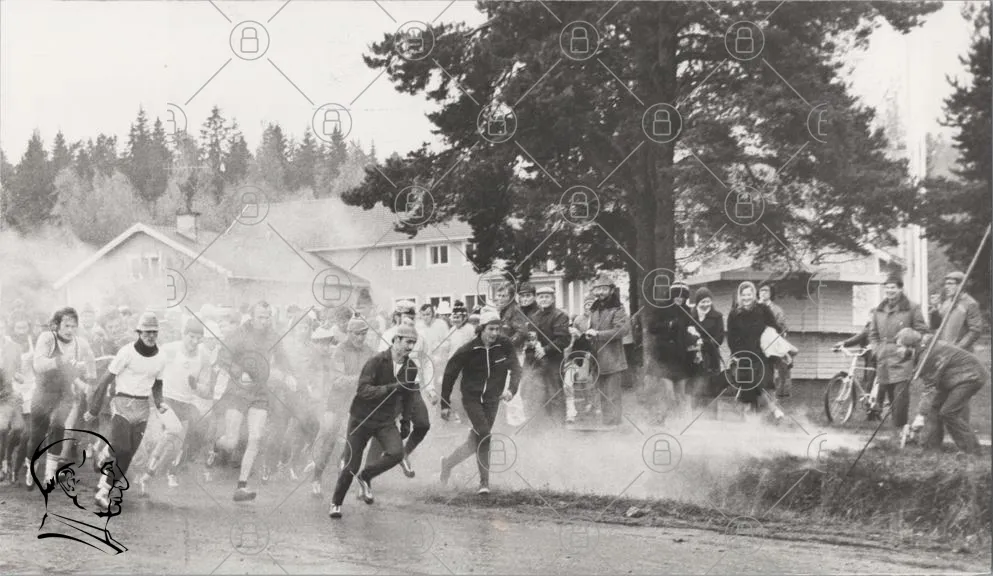 löpning, tävling, sport, människor, publik, träd, dimma, svartvitt, 1960-tal, utomhus, motion, entusiaster, kläder, landskap, väg, aktivitet, händelse, samling, glädje, energi, prestation