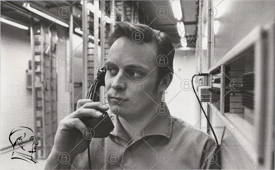 man, telefon, svartvit, kontor, kommunikation, 1960-tal, retro, teknik, samtal, kläder, hårstil, ansiktsuttryck, inomhus, vintage, telefonkiosk, professionell, arbetsmiljö, nostalgi, telefonlinjer, människa