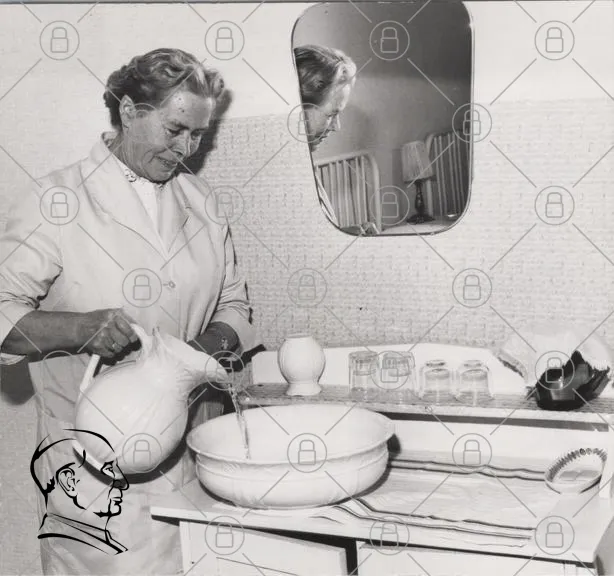 kvinna, mjölk, kanna, disk, spegel, kök, retro, svartvitt, hushåll, glas, skål, vatten, servera, gammaldags, inredning, handarbete, tradition, matlagning, hemlagat, 1950-tal, kvinnoarbete, hushållssysslor, hemliv, familjeliv, vardag, tidlös, nostalgi, hem